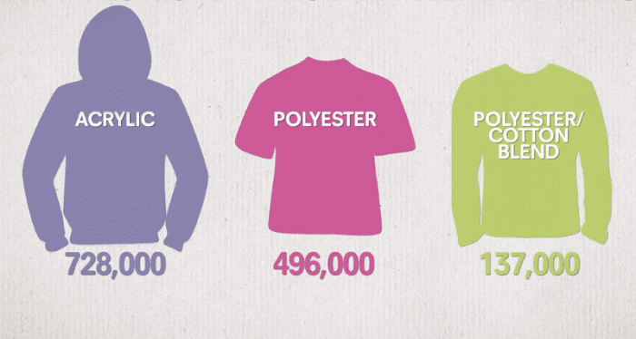 Os investigadores descobriram que cada ciclo de uma máquina de lavar pode libertar mais de 700 000 fibras microscópicas de plástico para o ambiente. O acrílico foi o material que libertou mais micro-fibras – quase 730 000 – por lavagem, cinco vezes mais do que o tecido de poliéster-algodão (137 951) e quase 1,5 vezes a quantidade libertada pelo poliéster (496 030).